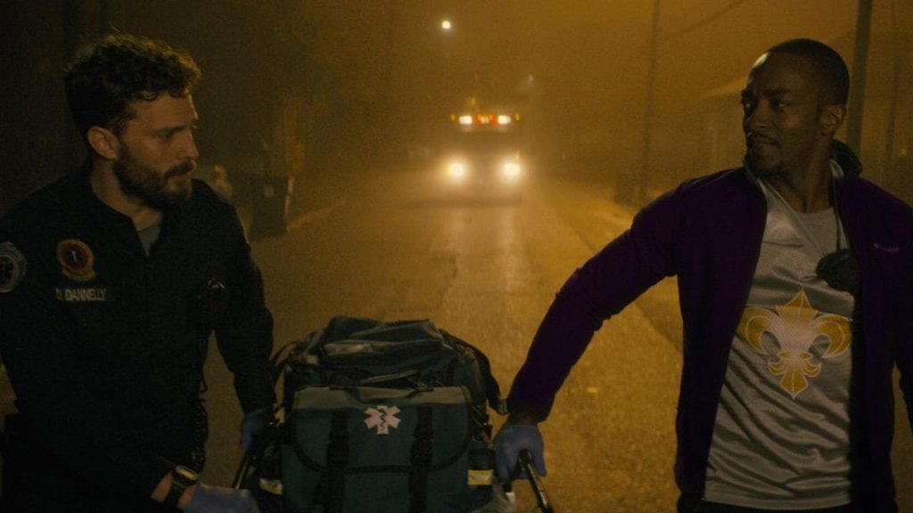Este é o trabalho mais hollywoodiano deles, com atores conhecidos, produção bem maior do que o de costume, mas nenhuma mudança no estilo de filmagem. Na história, Steve (Anthony Mackie) e Dennis (Jamie Dornan) são dois paramédicos e amigos de longa data. Na primeira emergência que vemos, envolvendo mais de uma overdose no mesmo local, a câmera se move sem cortes em um cenário realmente caótico. O motorista da ambulância erra o endereço, a polícia chega com informações erradas quase causando mais um acidente e um dos profissionais, vindo direto do rolê, nem uniformizado está! Ou seja, é uma noite qualquer para os dois, exceto por alguns detalhes, como um dos pacientes com um buraco que atravessou o corpo, feito por uma espada, autêntica e também presente na cena do crime.