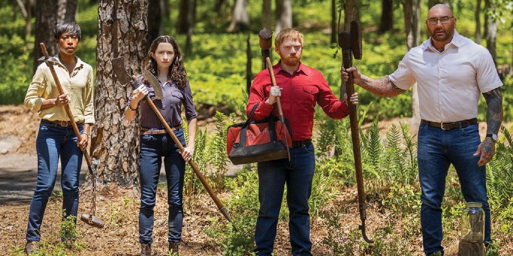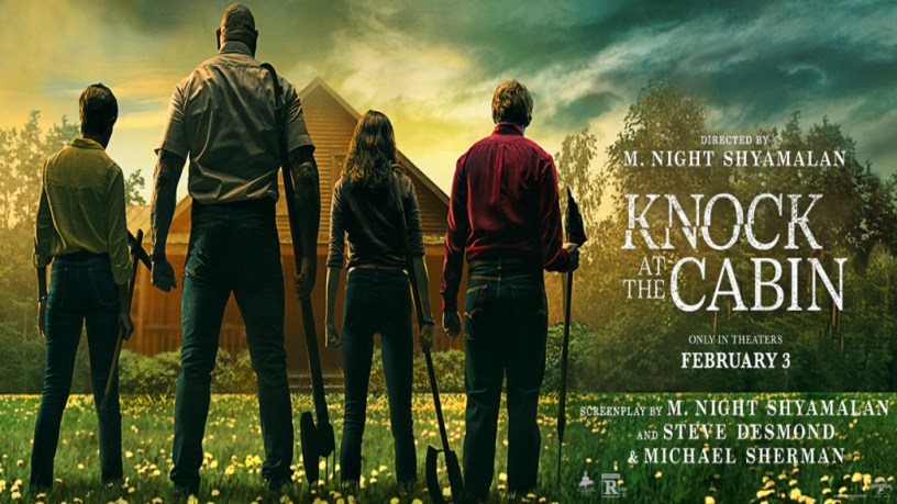 Batem à Porta não demora muito para empolgar, porque a história se move muito rápido, deixando adendos para serem inseridos nos diversos flashbacks por todo o filme. O mérito da direção, é que o trabalho de M. Night nos leva a eliminar desde o início a linha que separa mocinhos de bandidos, com uma ideia que parece simples na superfície, como era vendido no que o trailer se permitia revelar, mas que dissimuladamente surpreende quem só enxerga poder nos números de cada lado do conflito, ou no tamanho de Dave Bautista, um ator escalado exatamente para passar a impressão de ser invencível. Somos mantidos também em cima de um muro por muito tempo, sobre para qual lado torcer, com base em fatores sólidos, como o histórico notório do diretor, que inclui o mundo completamente fabricado de A Vila… e a fantasia inquestionável de A Dama na Água. As atuações são super convincentes dos dois lados, o dos intrusos que aparecem na cabana, com suas personalidades pés-no-chão, aliada a uma crença absurda e nenhuma vontade de cumprir com obrigações que juram não terem requisitado… e o lado dos invadidos, um casal homossexual com uma filha pequena e antecedentes de hostilização contra eles, duvidando do povo que aparece na casa com toda a educação, exigindo um ato violento para ir embora. Não podemos declarar apoio incondicional a nenhum deles, sem saber que versão de Shyamalan estamos recebendo aqui!