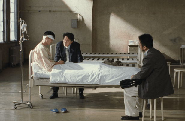Os crimes não param de acontecer, com aquela letra enorme do pescoço até o peito das vítimas, deixando um rastro de assassinos confessos/apavorados na cadeia e a polícia sem noção sobre como colocar um fim na epidemia. No comando está o detetive Takabe, vivido por Kôji Yakusho, uma super estrela no Japão e ator regular nos filmes de Kurosawa. O detetive é o marido daquela que moveu a mesa com a força do pensamento, após ler um trecho de Barba Azul. Não se sabe se as habilidades paranormais da esposa são inerentes, ou se elas surgiram depois que ela adoeceu, mas ela não é a única no filme com super poderes, sofrendo de problemas sérios para preservar memórias recentes. Durante as investigações, surge a figura de um jovem chamado Mamiya como principal suspeito. Confuso e sem saber a própria identidade, o andarilho se mostra um hipnotizador muito eficiente, com uma técnica simples e um interesse obsessivo na vida alheia. Um vilão difícil e irritante (mas não violento), ele torna impossível a tarefa de manter a paciência em sua presença, principalmente para o detetive que vive frustrado e ainda tem que ouvir repetições e variações de “hã?” ou “quê?”, toda vez que faz uma pergunta séria para o rapaz. Ele desperta o interesse da polícia, por ser o último a ter contato com os assassinos antes dos crimes. Preso antes da metade da história e com o público certo do seu envolvimento, resta provar a participação dele nos assassinatos, mesmo sem evidências e com um argumento quase fantasioso. Neste momento, eu me perguntei olhando para o tempo restante de filme, se era apenas isto mesmo o que restava para acontecer. Não era, porque esta não é uma narrativa comum.