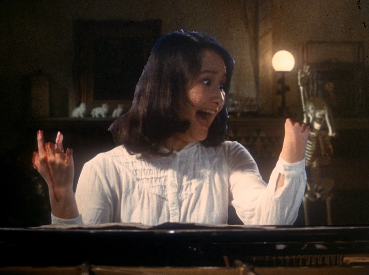 Não é apenas o visual, é a história que também parece infantil, por ser apresentada com uma doçura diabética, na superfície. Diversas princesas, uma bruxa sobrenatural, móveis vivos e nenhuma noção de perigo real, por parte das adolescentes sendo eliminadas, uma por uma, com uma violência horripilante. Todas distraídas, exceto por Fanta, que observa amigas desaparecendo, corpos se multiplicando e a tia de Oshare aprontando, mas quem daria crédito para uma testemunha que fanta… sia demais? Trata-se de um filme sinistro, cujo surrealismo deixa de ser fofinho aos poucos, para se tornar infernal, mas de uma certa forma, ele nunca perde o ar juvenil e eu acho que saquei a proposta deste trabalho icônico do cinema japonês de terror. É como se uma criança, ou diversas delas estivessem tentando contar uma história de terror para um adulto, que anota tudo e não questiona os absurdos, apenas questiona o próximo passo até o absurdo seguinte. O segredo é fazer de tudo para que o roteiro permaneça fiel ao relato, sem perder o sentido, a inocência e a atenção de um público que até topa umas viagens na maionese, mas ainda espera ver sangue.