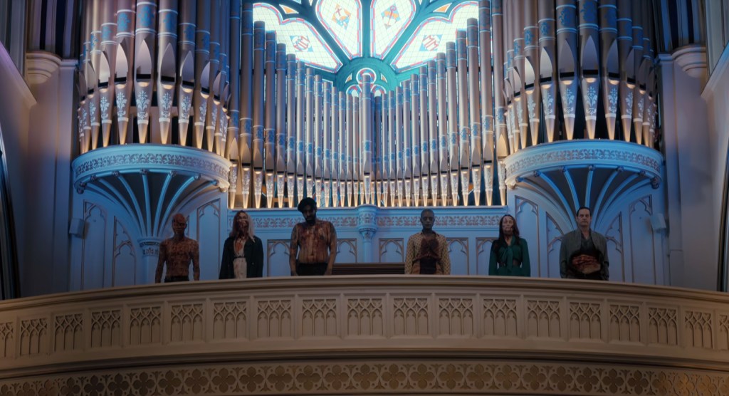 Sabemos que na série, duas mulheres trabalham com chimpanzés e quando eles começam a ganhar mais destaque no episódio, eu mal consigo conter meu entusiasmo. Flanagan tem que mostrar o ocorrido, já que a causa da morte não será um mistério e Poe, pela época de lançamento do conto, teve que se restringir a apenas descrever o estado dos corpos. Infelizmente, entre as histórias do velho Usher para o promotor, utilizando milagrosamente flashbacks secretos de toda a família, a direção decide não apelar para o grotesco e a única coisa inesperada é a vítima.
