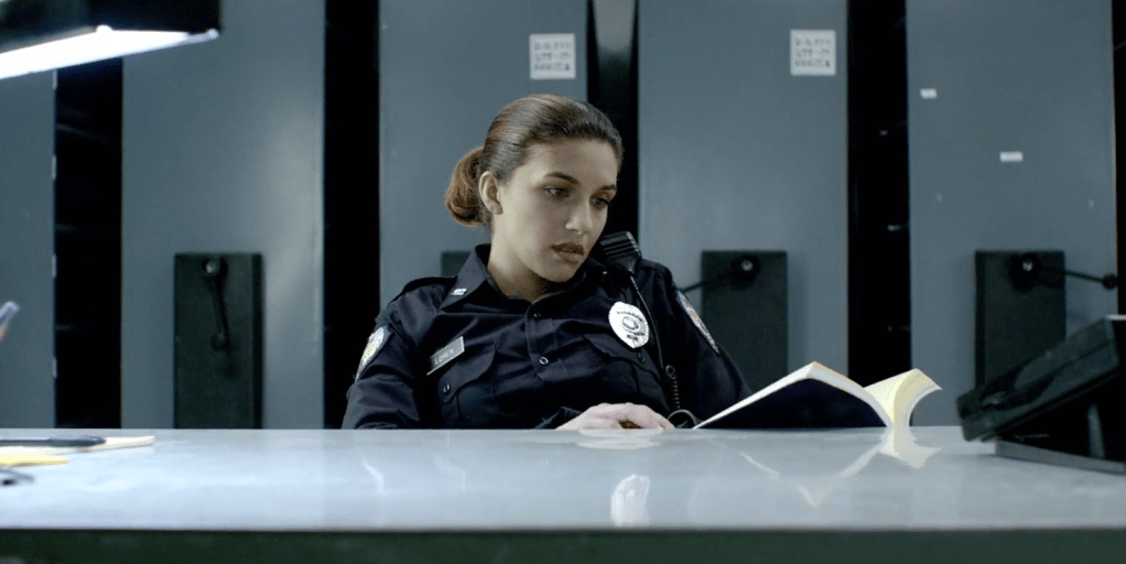 Manter a personagem principal na busca por respostas racionais, para eventos que já percebemos como sobrenaturais, é um belo truque para segurar a novata no local, até que fugir dele vire um desafio. Assim como é de grande valia reforçar o quanto Jessica é inexperiente, o quanto ela, sendo filha de um policial morto em serviço, tem medo de parecer inapta para os colegas que ainda nem conhece. Você já imaginou manchar sua reputação no primeiro dia no emprego, e não um emprego qualquer, um trabalho que exige treinamento e se torna uma carreira, por alegar que está sofrendo assédio demoníaco? Que tipo de policial despreparado tem medo de ficar em um prédio vazio? Dá para imaginar a gozação? Seria o fim antes mesmo de começar. Então, passando por incidentes inexplicáveis e cada vez mais assustadores, ela sofre sozinha, requisitando ajuda enquanto esconde informações cruciais sobre a própria situação e assim, nunca obtendo a assistência necessária. A verdade é que alguns membros da força policial já sabem, mas não avisaram, que o lugar se tornou amaldiçoado após a captura de uma família de satanistas homicidas, que se suicidou na cela. O que aqueles espíritos estão fazendo ali, é o mesmo que faziam em vida: atormentar inocentes, com o objetivo de fazê-los aderir à causa deles. Exatamente por isso, um dos elementos mais importantes e estressantes de observar no filme, é o relógio de parede na recepção, que mostra quanto tempo Jessica ainda precisa aguentar a tortura, até poder passar o plantão.