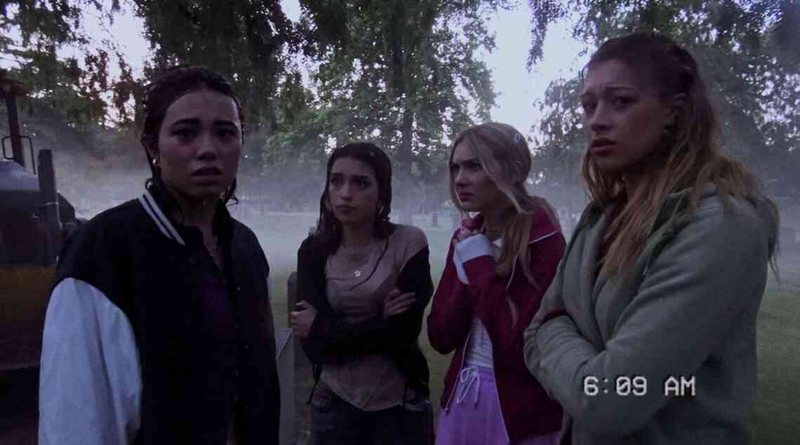 Com um grupo de personagens desagradáveis, desrespeitando o local de uma tragédia que matou outros personagens desagradáveis, o filme começa oficialmente e não muito bem. “Shredding” (que pode ser traduzido como “retalhar” ou interpretado como “arrasar”, se considerarmos o contexto de que este é um conto sobre bandas de rock e o termo em inglês é utilizado por guitarristas); fala utilizando bastante clichês de uma banda de adolescentes, tentando apavorar o baterista com uma visita a um antigo local de shows subterrâneo, desativado após um incêndio que matou os membros de outra banda. O que aprendemos é que os mortos do local eram ídolos dos visitantes, mas não faz diferença. Aprendemos também que aquela estava longe de ser a primeira visita ao local da tragédia, mas também não faz diferença e aprendemos que não há pé, cabeça ou coração investidos nesta narrativa. Com toda a preocupação em recriar as roupas, as gírias, a atitude inovadora de quem nem se dava conta do quanto era igual a todo mundo, eu não acho que era pedir demais um curta de abertura mais interessante, que fosse menos escrachado e com personagens cujo bem-estar fosse uma preocupação para o público. Se este não for o pior da franquia, está perto de ser. Em seguida voltamos a um cemitério, com as universitárias exigindo prova de fogo para quem quer participar do clubinho da popularidade delas. “Oferta Suicida” é o curta que definitivamente jamais deveria ter sua captação justificada, pelo conteúdo incriminatório que perseguiria as participantes, mesmo se o negócio desse certo, mas há pelo menos ótimas e angustiantes cenas no caixão, se estivermos dispostos a ignorar toda a lógica por trás deste argumento.
