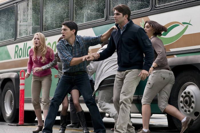 Ainda bem que o título original de A Última Premonição, ficou obsoleto logo após a chegada do quinto filme, porque seria um pecado encerrar a série com este que é o mais fraco de todos. Com os eventos sendo desencadeados após a confusa e desinteressante tragédia inicial, conhecida como “O Acidente na Pista de Corrida”, Premonição 4 possui apenas um aspecto que eu considero valoroso o suficiente, para não desejar que o filme seja varrido para o canto subconsciente das nossas mentes, que é a sequência de “Mortes do Shopping”. Eu não consigo compreender como não usaram a explosão no cinema, que acaba reciclando bem uma ideia do anterior, para abrir a maldição em grande estilo… ou em um estilo mais envolvente . O filme ainda utilizou uma ferramenta que envelheceu mal, porque a febre das produções 3D passou e deixou para trás um monte de cenas em ângulos bizarros, que agora não fazem muito sentido. O que também exige que o público esqueça o bom senso pela duração do filme, são a maioria das fatalidades, com destaque para duas cenas completamente ridículas envolvendo água e acontecendo ao mesmo tempo em lugares diferentes.