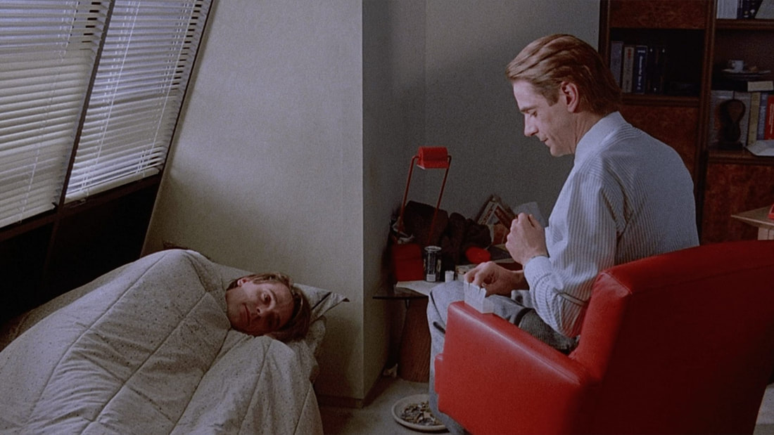 Este foi o filme que transformou a vida de Jeremy Irons, de um ator britânico familiar para uma estrela de Hollywood bastante requisitada, que passou a fazer muito mais filmes por ano do que anteriormente, conquistando prêmios e mantendo o próprio nome relevante por décadas, em uma indústria competitiva e discriminatória. Por mais que este fosse um dos mais fáceis de digerir de Cronenberg… e falaremos mais do diretor adiante… é notável que depois dos 40 e em uma obra sob o risco de ser rejeitada pelo grande público, como tantas outras do criador underground, o ator tenha conseguido tanto destaque na carreira posteriormente. A interpretação de Irons como os gêmeos doentios é impressionante, não só porque são dois papéis diferentes em um só filme, mas pelo que Cronenberg queria que a história transmitisse. Tem uma cena em que Elliot pergunta a Beverly, como ele se saiu no “papel de Elli”, quando precisou se passar pelo irmão em uma festa beneficente. Bev começa então a imitar exageradamente os trejeitos superficiais de Elli, tido como o extrovertido da dupla, com um certo deboche e um pouco de rancor, para a total surpresa de Elliot. Os dois disfarçam a animosidade, a tempo dela ser desconsiderada com sucesso, mas é a partir dali que fica mais claro quem é quem para o público. Isto é importante, porque o diretor “esquece” de nos esclarecer a dúvida, em muitas cenas, precisando de um ator bom o suficiente para nos deixar seguros… e para nos desestabilizar na mesma questão. Eu não consigo imaginar alguém além de Irons para esta tarefa complexa.